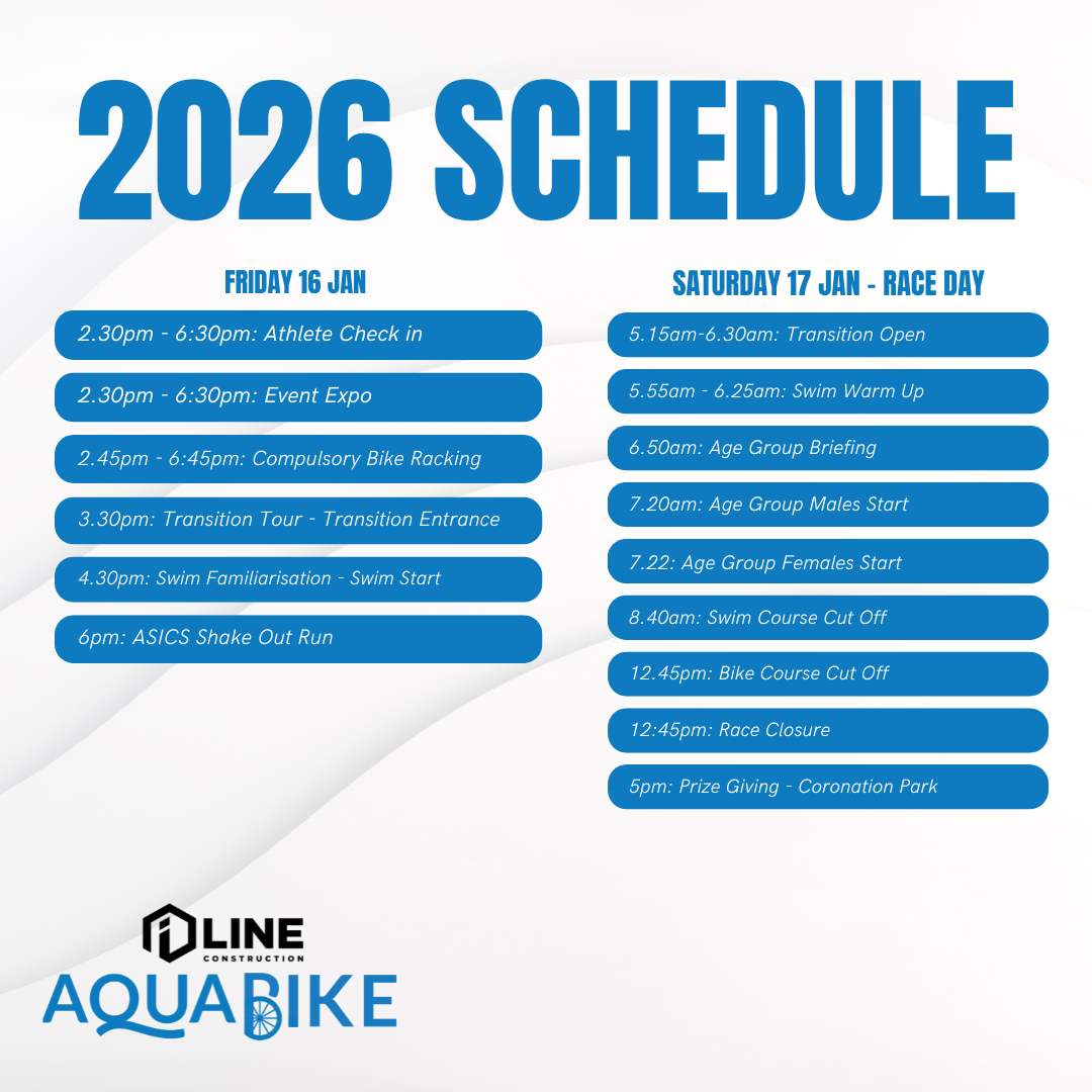 The iLine Construction AquaBike is run under Tri NZ Rules. The event runs 5 year age groups with your age calculated as at 31 December the year of the event. This will mean many of you will ‘age up’ one year.